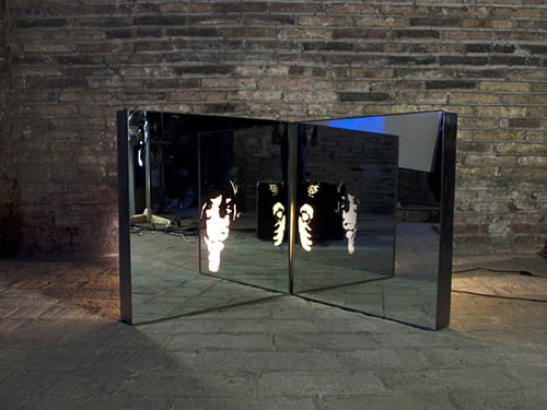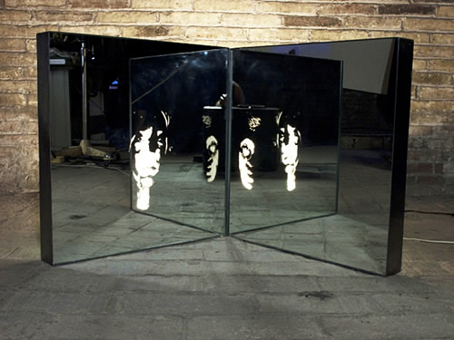 Série de Cajas de Luz, en hierro pulido y espejo. El espejo trabajado en chorro de arena creando un bajo relieve. Dimensiones 65cm X 65cm. Concepto : piezas inquietantes, que abren una puerta a lo oculto del ser, una 3ª dimensión profunda en la psicología del ser.